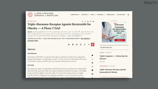 - Jastreboff, A.M., et al. (2023). Triple-Hormone-Receptor Agonist Retatrutide for Obesity — A Phase 2 Trial. New England Journal of Medicine. DOI: 10.1056/NEJMoa2301972